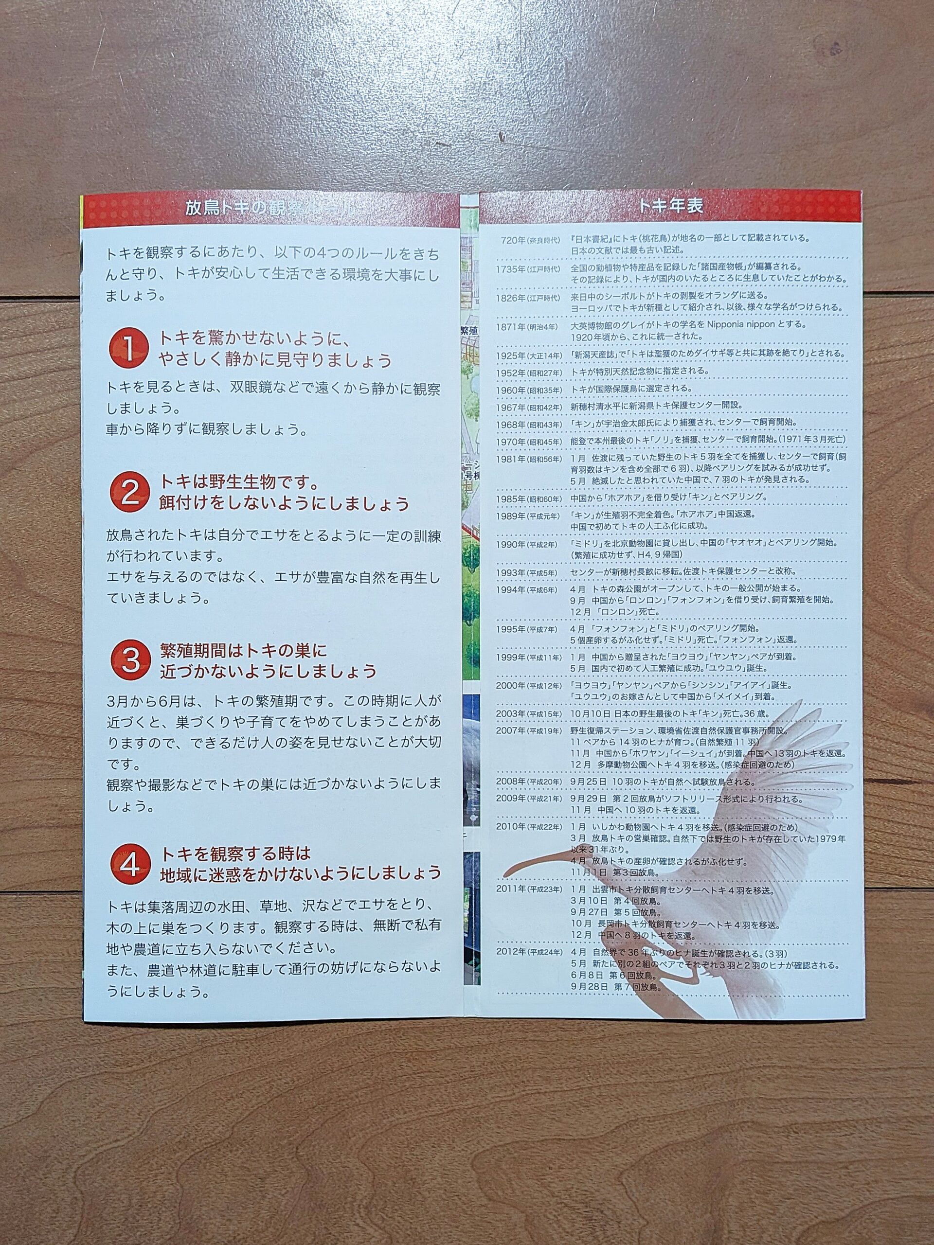 現在では「トキのテラス」や「トキふれあいプラザ」など、トキを間近に見られる施設が充実していますが、このパンフレットからは、まだ「絶滅」という言葉が重く、保護活動に独特の緊張感があった頃の空気を感じます。