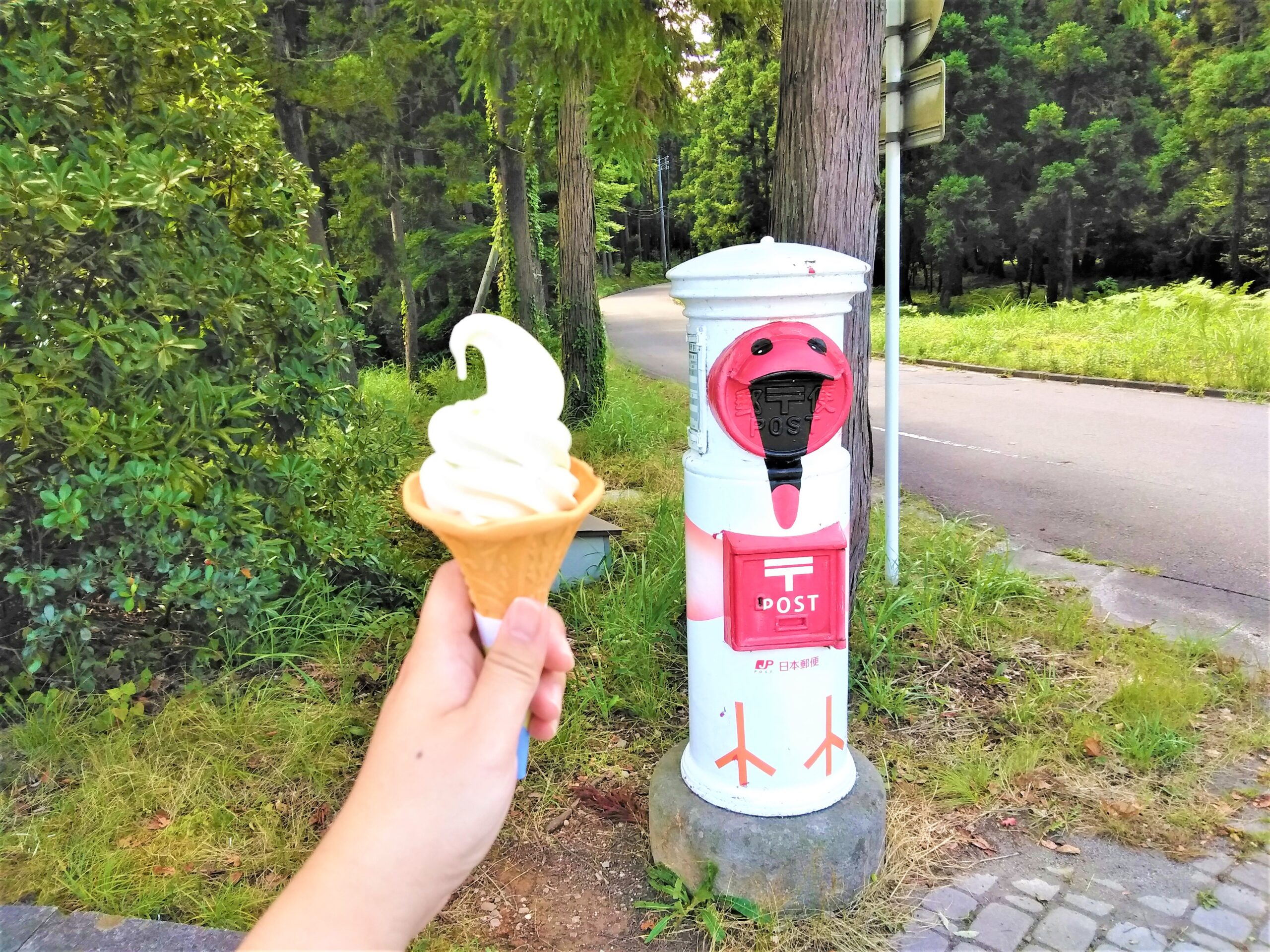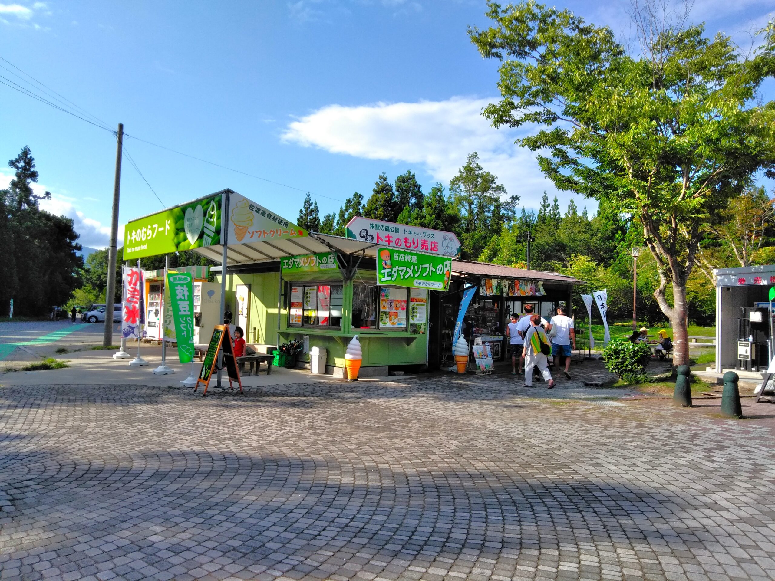 施設に入館しなくても、駐車場のすぐ横にある売店で手軽に買えるのです。すぐ近くには野生復帰のシンボルである赤い「トキポスト」もあり、私にとってはお馴染みの風景です。