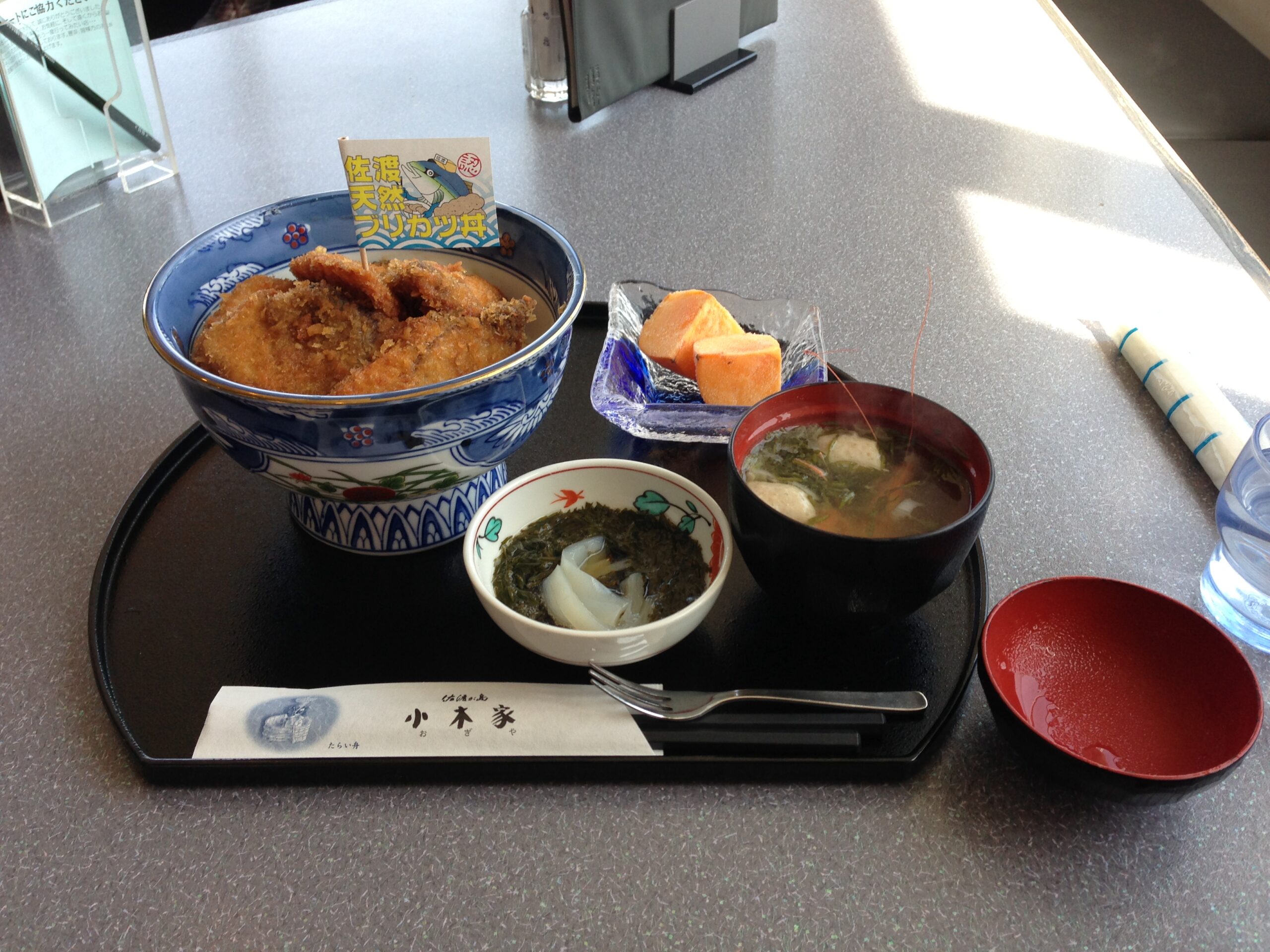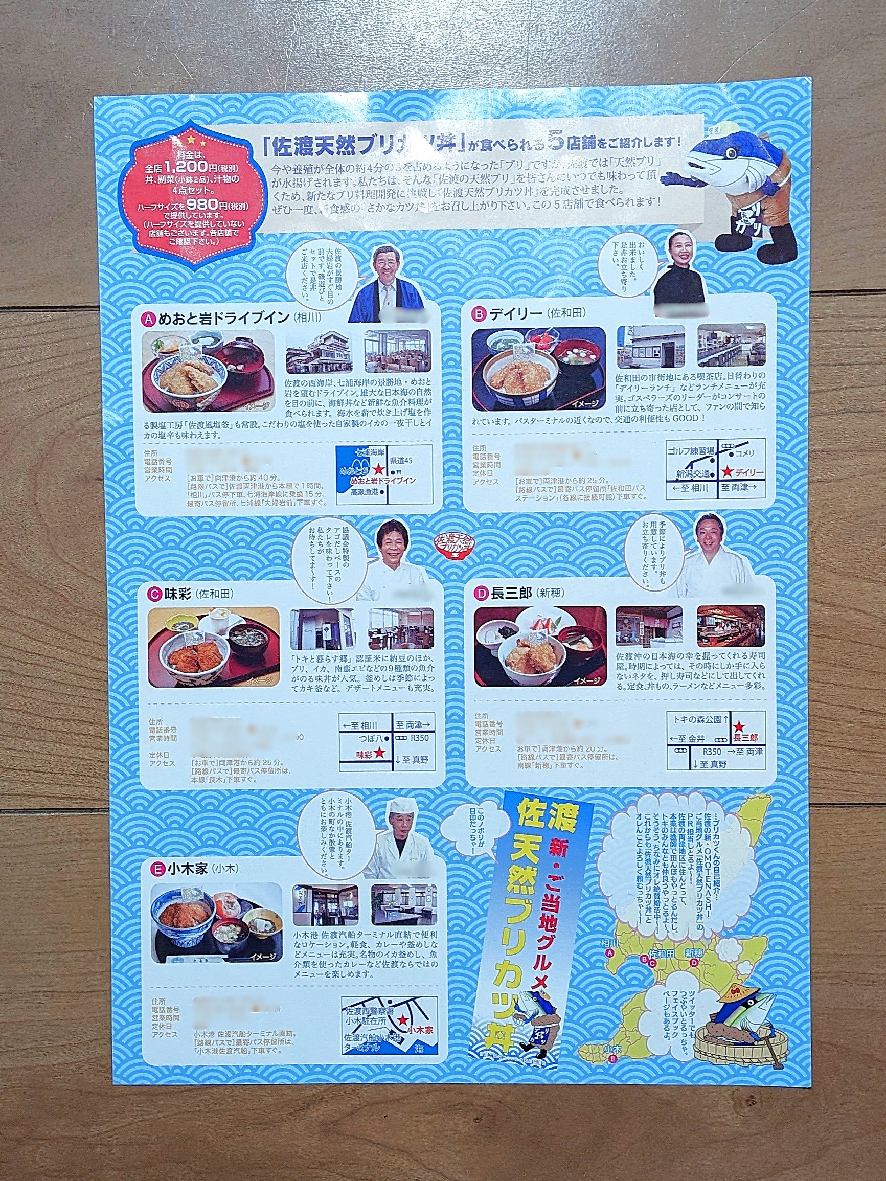 今回ご紹介するのは、小木港のすぐ近くにある「小木家」さんでいただいた、佐渡天然ブリカツ丼のパンフレットです。