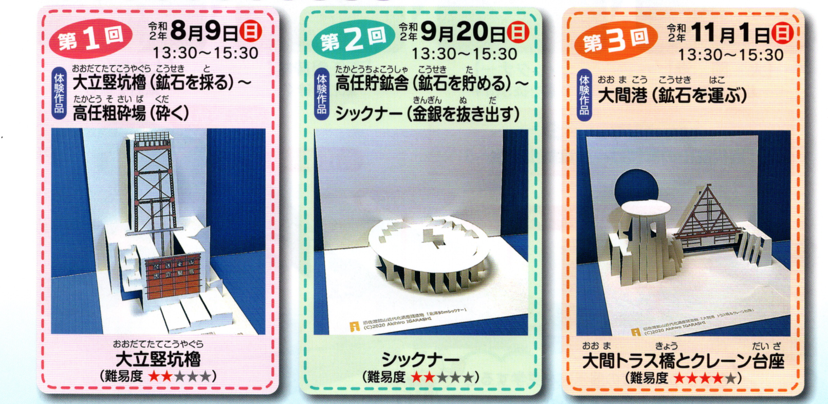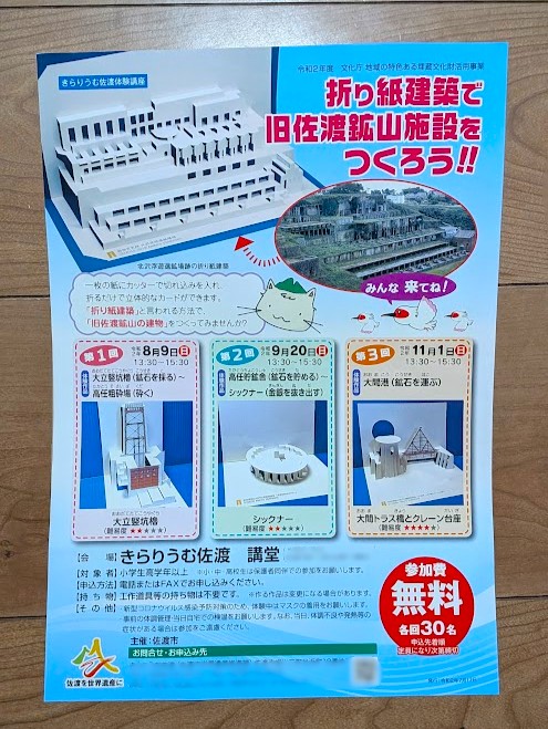 私は令和2年に「きらりうむ佐渡」を訪れて『折り紙建築で旧佐渡鉱山施設を作ろう』という企画の案内チラシを記念に持ち帰りました。