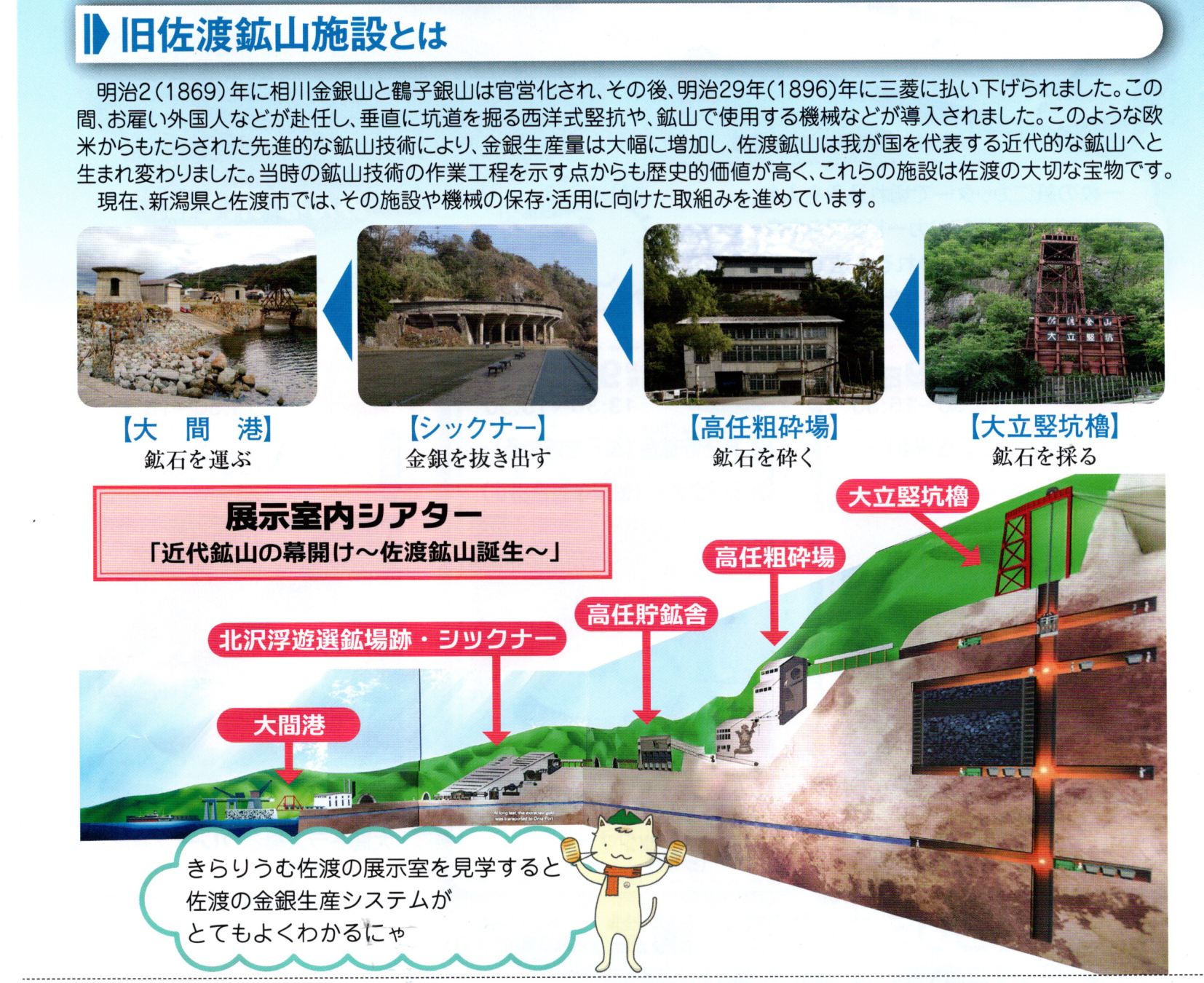 チラシ裏面には、大立竪坑櫓から大間港まで繋がる「金銀生産システム」の図解もあり、山から海へ続く壮大な流れが本当によく分かります。