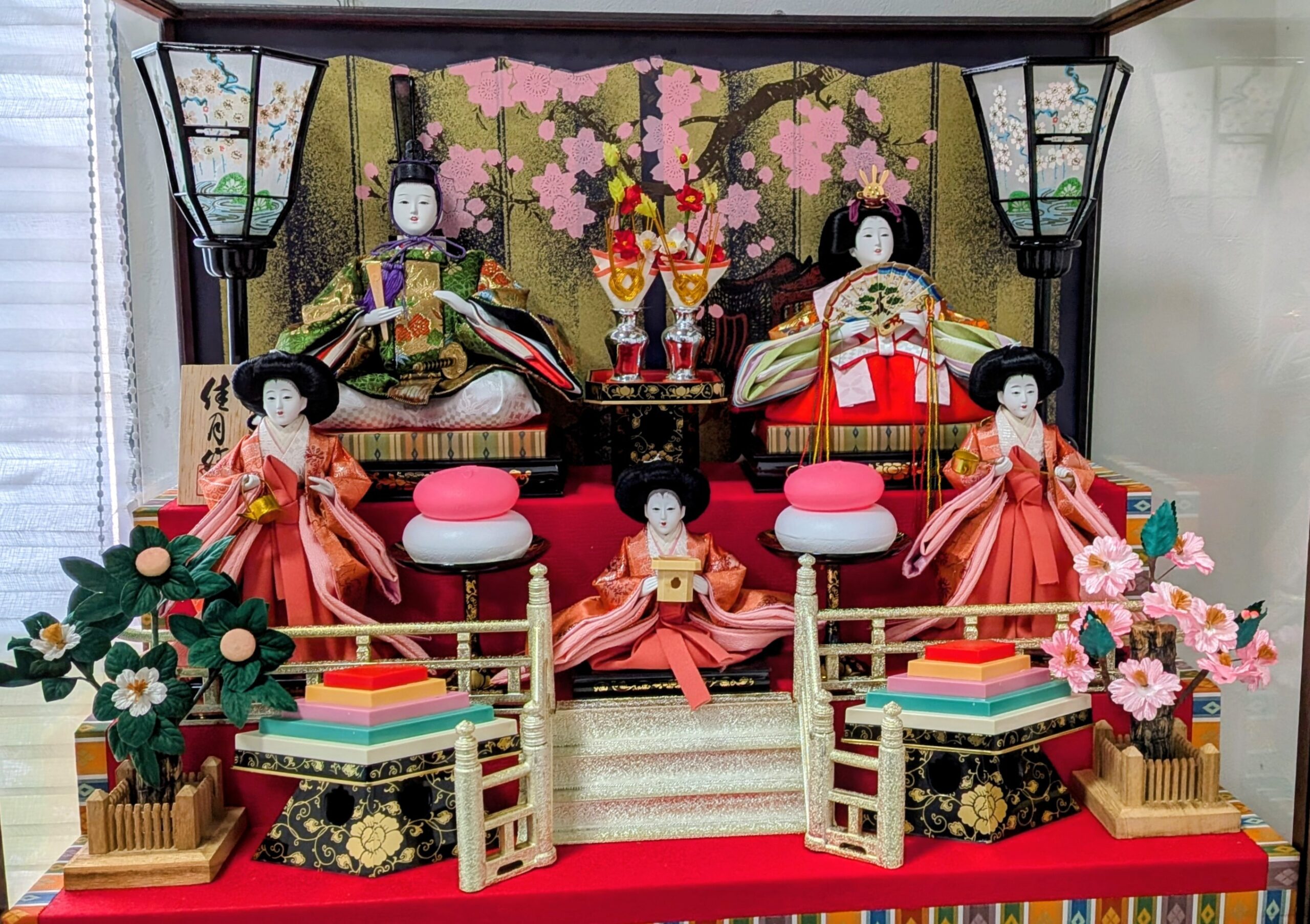 ひなまつりにちなんだ小物や雑貨も一緒に飾られており、とても厳かで華やかな空間でした。
