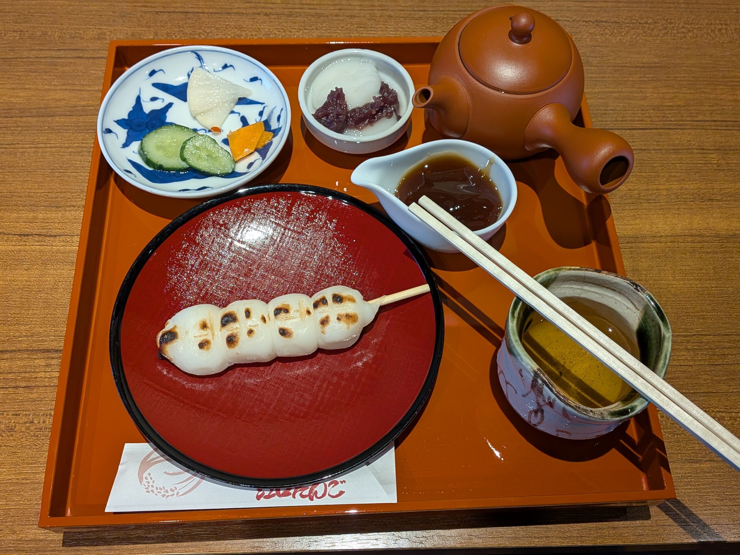 先輩は摂田屋おだんごセットで飲み物は温かい粕雪ほうじ茶をセレクト。(写真を撮る前に食べようと下ので慌てて止めて写真を撮らせてもらったのですが、後から写真を見返したら箸がとても邪魔だった(;^ω^)w)